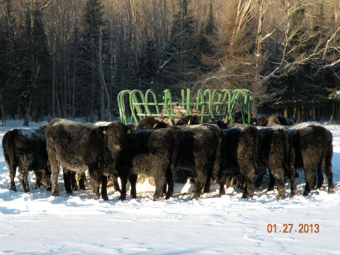 During the winter months, we feed large round bales of haylage. Having been in the dairy business for so many years, I learned a lot about producing high quality feed. The saying "We are what we eat", applies to our cattle here at Black Hills Angus. We purchase all of our winter hay from local farms who have extra feed to sell. I want our cattle to get the best feed available so I don't look for "beef hay or heifer hay"; I look for early cut dairy feed. By purchasing all of our hay from various local producers, I don't risk having to feed poor quality hay. In October, we round up the herd and fence line wean the calves. The calves are kept in a corral with their mothers on the other side of the fence for three days. The cows then go to their winter paddocks down over the hill in a sheltered area with tree and boulder windbreaks. They have fresh clean water and hay available 24/7. The calves are released to the pastures around the house so we can keep a close eye on their health and progress. These pastures also provide shelter and fresh water all winter long. From weaning on the calves get a little grain daily along with the very best hay we can find. They do not receive growth hormone implants or animal byproducts. These animals' diet is primarily grass, with a small amount of grain, for extra energy in the winter and marbling in the meat. Our belief is this gives our meat that extra flavor. In the spring, they return to rotational grazing until October. |